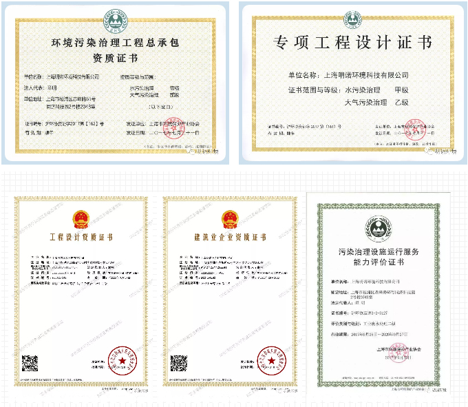 通過(guò)不懈努力明諾環(huán)境獲得了一系列環(huán)保領(lǐng)域資質(zhì)證書(shū),包括環(huán)境工程設計專(zhuān)項(水污染防治工程)乙級證書(shū)、環(huán)保工程專(zhuān)業(yè)承包三級證書(shū)、環(huán)境污染治理工程總承包資質(zhì)證書(shū)、專(zhuān)項工程設計證書(shū)水污染治理甲級、大氣污染治理乙級證書(shū)和污染治理設施運行服務(wù)能力評價(jià)證書(shū),同時(shí)成為上海市環(huán)境保護產(chǎn)業(yè)協(xié)會(huì )會(huì )員單位。