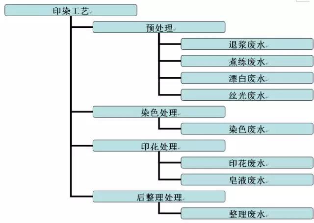 印染廢水不單單產(chǎn)生于染色過(guò)程中,印染過(guò)程分多個(gè)工序,每一道工序都要排出廢水,預處理階段(包括燒毛、退漿、煮煉、漂白、絲光等工序)要排出退漿廢水、煮煉廢水、漂白廢水和絲光廢水,染色工序排出染色廢水,印花工序排出印花廢水和皂液廢水,整理工序則排出整理廢水。