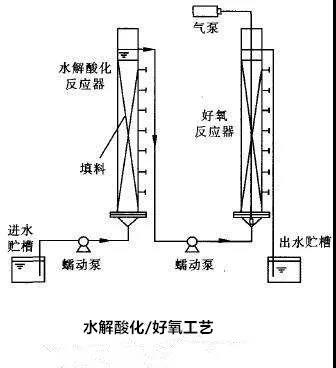 水解酸化-好氧工藝:水解酸化與好氧法結合的厭氧處理已不是傳統 的厭氧消化,水力停留時(shí)間一般為3~5 h,只發(fā)生 水解和酸化作用。這一工藝流程的提出主要是針對 印染廢水中可生化性很差的一些高分子物質(zhì),期望 他們在厭氧段發(fā)生水解、酸化,變成較小的分子, 從而改善廢水的可生化性,為好氧處理創(chuàng )造條件, 并能較好地解決PVA、染料的處理問(wèn)題。