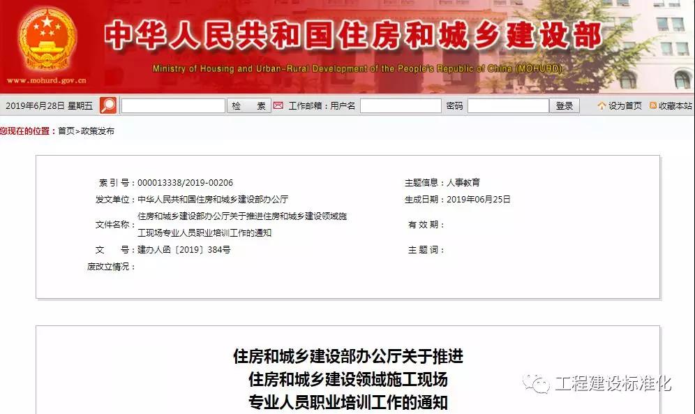 2019年6月28日住建部官網(wǎng)發(fā)布《關(guān)于推進(jìn)住房和城鄉建設領(lǐng)域施工現場(chǎng)專(zhuān)業(yè)人員職業(yè)培訓工作的通知》(建辦人函[2019]384號)。八大員職業(yè)培訓工作正式啟動(dòng):