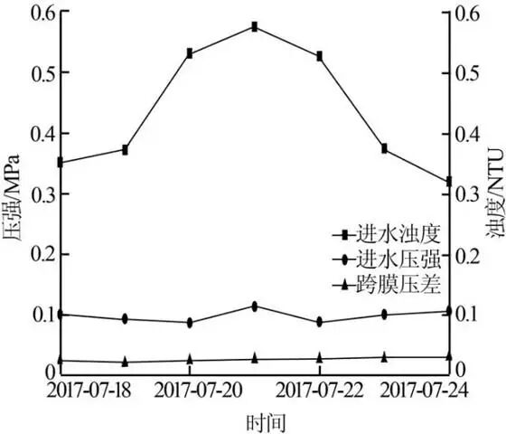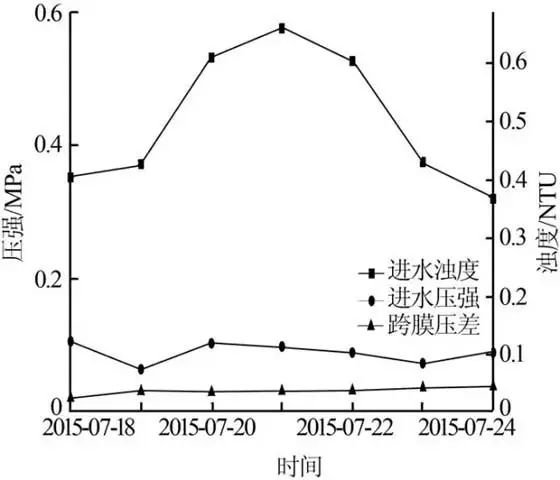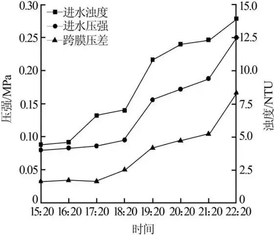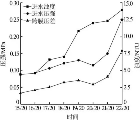 圖1:1號超濾污堵前進(jìn)水濁度、壓強及壓差
