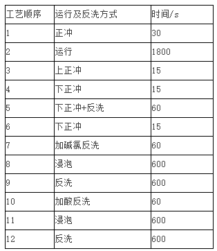 超濾系統運行過(guò)程中運行30min進(jìn)行1次水反洗(將上述過(guò)程簡(jiǎn)寫(xiě)為制水+水反洗)。制水+水反洗連續運行25次后進(jìn)行1次堿氯(加堿和次氯酸鈉)反洗和酸反洗,隨后,重新開(kāi)始以上循環(huán)過(guò)程。超濾系統正常運行時(shí)運行及反洗方式見(jiàn)表1。