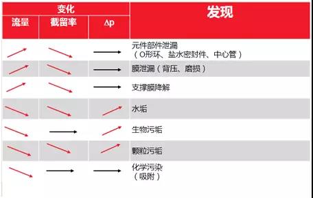 毫無(wú)疑問(wèn),調查過(guò)程取決于所發(fā)現的問(wèn)題。如果透鹽率上升,即脫鹽率下降,則表明膜或元件可能出現化學(xué)或機械損壞。另一方面,滲透流量減少通常是由于有機、生物或無(wú)機污垢所致。下表概述了過(guò)濾性能降低的趨勢和潛在原因。