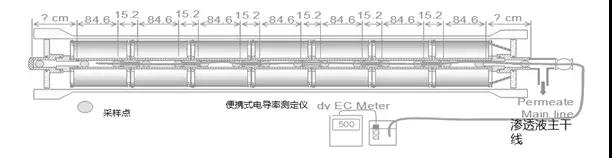 如流量增加而脫鹽率下降,在任何測量值顯著(zhù)升高的情況下,應檢查所有膜殼的產(chǎn)水電導率。針對有明顯問(wèn)題的任何一根管道,可以采用“中心管測試方法”來(lái)識別哪支膜元件。具體測試包括將軟管伸入螺旋卷繞元件的中心管,一直到壓力管的末端,然后慢慢地將其拉出,獲取軟管中的部分滲透液。然后對樣品的電導率進(jìn)行測試。如果某一點(diǎn)的值突然升高,可根據已經(jīng)拉出的軟管長(cháng)度來(lái)確定泄漏的位置。