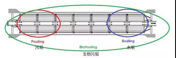 有機污垢主要導致上游側管道堵塞,而如果下游側鹽含量較高,可能導致鹽沉淀,即無(wú)機污垢或水垢。生物污垢可以擴散到整個(gè)系統,因此可存在于各個(gè)點(diǎn)。