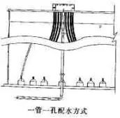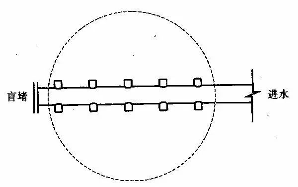 在一根管上均勻布水雖然在理論上是可行的,但在實(shí)際中往往是不可實(shí)現的,因為這種系統隨著(zhù)時(shí)間有些孔口將不可避免發(fā)生堵塞。而進(jìn)水將從沒(méi)有堵塞的其他孔口重新分配,從而導致在反應器池底的進(jìn)水分布不均勻,因此應該盡可能避免在一個(gè)管上有過(guò)多的孔口。目前這種布水方式已較少采用。