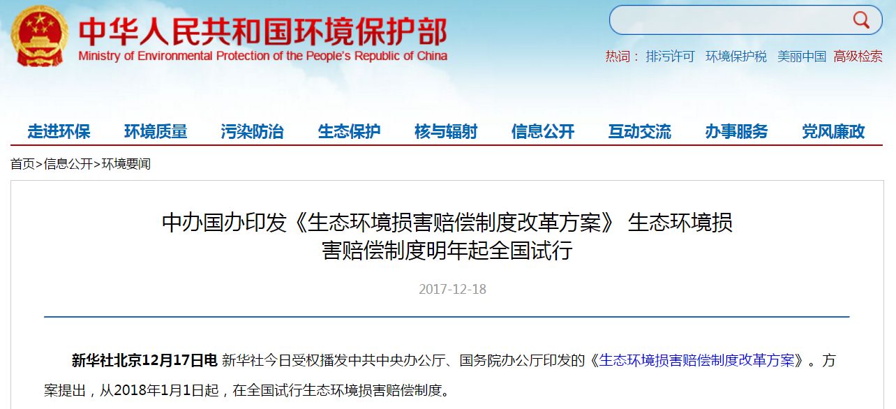 《改革方案》規定,從2018年1月1日起在全國試行生態(tài)環(huán)境損害賠償制度。