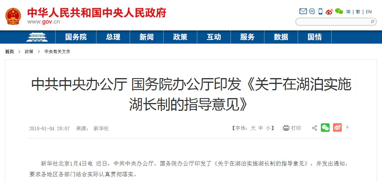 1月4日,在“河長(cháng)制”推出一年后,中辦、國辦印發(fā)了《關(guān)于在湖泊實(shí)施湖長(cháng)制的指導意見(jiàn)》,要求各地在2018年年底前全面建成湖長(cháng)制。