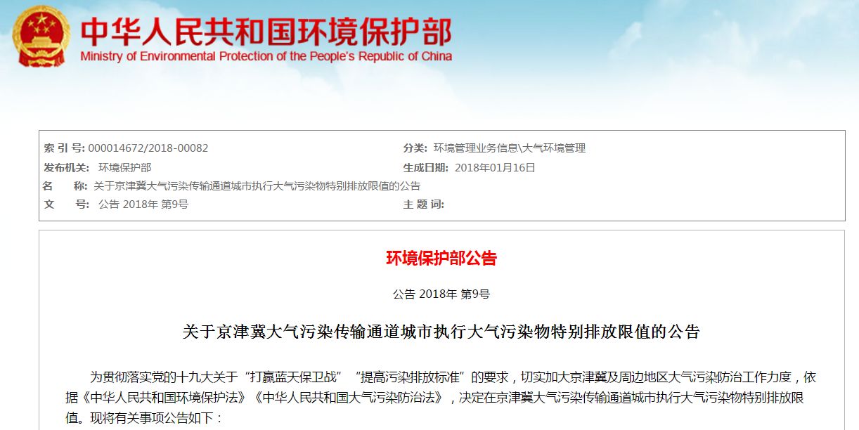 1月16日,環(huán)保部印發(fā)了《關(guān)于京津冀大氣污染傳輸通道城市執行大氣污染物特別排放限值的公告》,要求京津冀大氣污染傳輸通道城市(“2+26”城市)將執行大氣污染物特別排放限值。