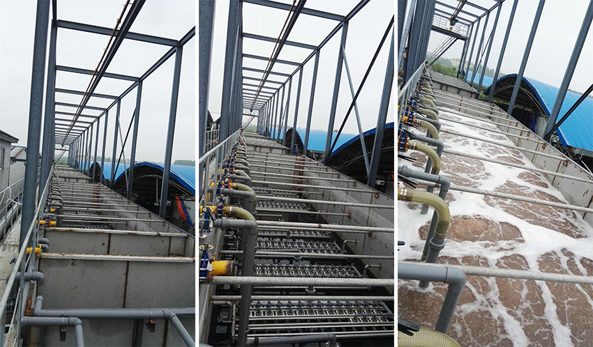 在膜生物反應器中,膜組件(由中空纖維膜或平板膜等組成)浸放于膜池中,由于膜10-1微米級的孔徑可完全阻止細菌的通過(guò),所以將菌膠團和游離細菌全部保留在膜池中,只將過(guò)濾過(guò)的水匯入集水管中排出,從而達到泥水分離,無(wú)需設置二沉池,各種懸浮顆粒、細菌、藻類(lèi)、濁度和COD及有機物均得到有效的去除,保證了出水懸浮物接近零的優(yōu)良出水水質(zhì)。由于微濾膜的近乎百分的菌種隔離作用,可保持活性生物污泥不流失,通過(guò)污泥回流至好氧區,這樣不僅提高了曝氣池抗沖擊負荷的能力,提高了曝氣池的負荷能力,而且一定程度上減少了所需的曝氣池容積,降低生化系統的土建投資。