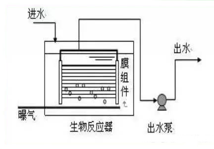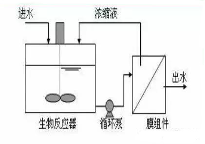 如圖2,把膜組件和生物反應器分開(kāi)設置。生物反應器中的混合液經(jīng)循環(huán)泵增壓后打至膜組件的過(guò)濾端,在壓力作用下混合液中的液體透過(guò)膜,成為系統處理水;固形物,大分子物質(zhì)等則被膜截留,隨濃縮液回流到生物反應器內。